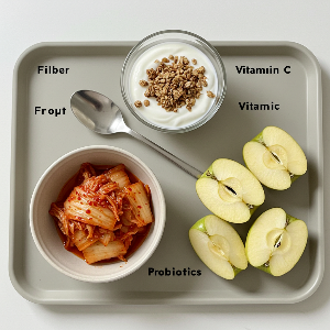 발효식품(김치, 요구르트), 식이섬유 풍부한 채소와 과일은 장내 유익균을 늘려 면역력을 높입니다.