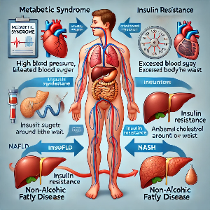 대사증후군은 고혈압, 혈당 수치 상승, 허리 주변의 과도한 체지방, 비정상적인 콜레스테롤 수치를 포함하는 일련의 질환입니다. 이는 NAFLD의 주요 위험 요소입니다. 대사증후군이 있는 개인은 혈당 조절에 도움이 되는 호르몬인 인슐린에 신체 세포가 덜 반응하는 상태인 인슐린 저항성이 발생할 가능성이 더 높습니다.